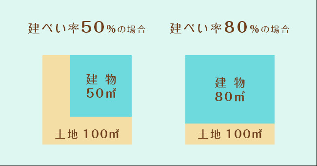 敷地面積100㎡の場合 ・建ぺい率50%→建築面積50㎡まで ・建ぺい率80%→建築面積80㎡まで