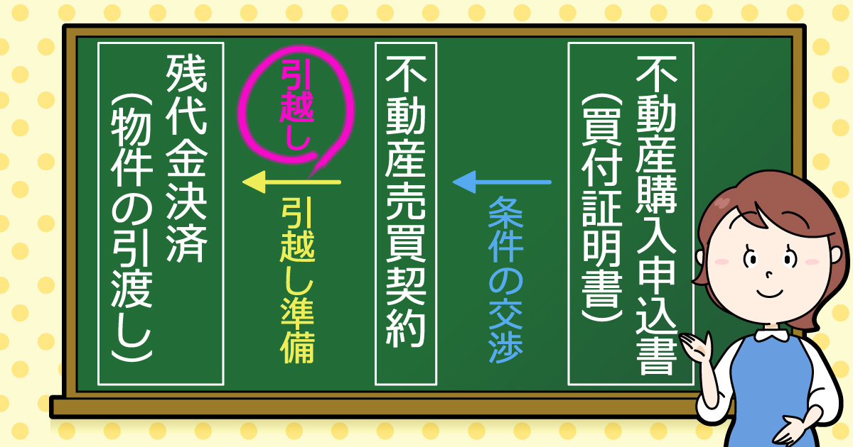 そのため、不動産売買契約を結んでから、売主は物件を引渡す準備(引越しやローンの返済手続き・抵当権抹消登記手続きの準備など)を、買主は物件を引受ける準備(正式な住宅ローンの契約など)を行います。